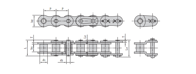 節距 | 滾子直徑 | 內節內寬 | 銷軸直徑 | 銷軸長度 | 內鏈板高度 | 鏈板厚度 | 抗拉強度 | 平均抗拉強度 | 每米長重 | ||