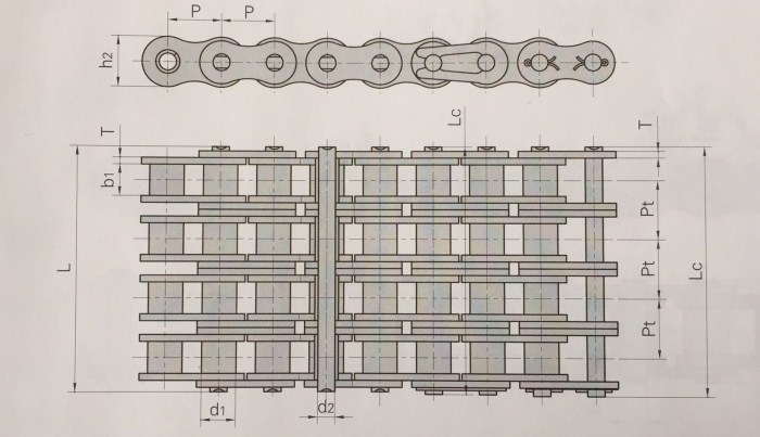 | 鏈號 | 鏈號 | 節距 | 滾子直徑 | 內節內寬 | 銷軸直徑 | 銷軸長度 | 內鏈板高度 | 鏈板厚度 | 排距 | 抗拉強度 | 平均抗拉強度 | 每米長重 | |
