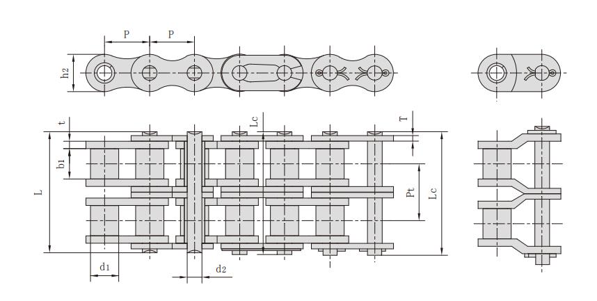 鏈號(hào) 節(jié)距 滾子直徑 內(nèi)節(jié)內(nèi)寬 銷軸直徑 銷軸長(zhǎng)度 內(nèi)鏈板高度 鏈板厚度 排距 抗拉強(qiáng)度 平均抗拉強(qiáng)度 每米長(zhǎng)重