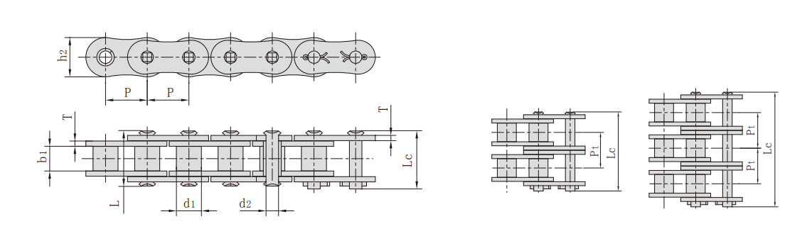 | 鏈條型號 | 節(jié)距 | 滾子直徑 | 內(nèi)節(jié)內(nèi)寬 | 銷軸直徑 | 銷軸長度 | 內(nèi)鏈板高度 | 鏈板厚度 | 抗拉強(qiáng)度 | 每米長重 | ||