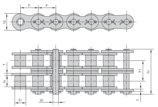 | 鏈號 | 鏈號 | 節距 | 滾子直徑 | 內節內寬 | 銷軸直徑 | 銷軸長度 | 內鏈板高度 | 鏈板厚度 | 排距 | 抗拉強度 | 平均抗拉強度 | 每米長重 |