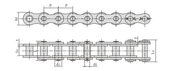 套筒鏈主要型號有:節距,套筒直徑,內節內寬,銷軸直徑,銷軸長度,鏈板高度,鏈板厚度,抗拉強度,每米長重