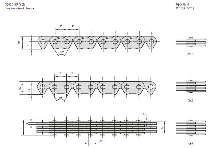主要型號有:節距,鏈寬,銷軸直徑,銷軸長度,鏈板高度,鏈板厚度,導向型式,片數,抗拉強度,每米長重