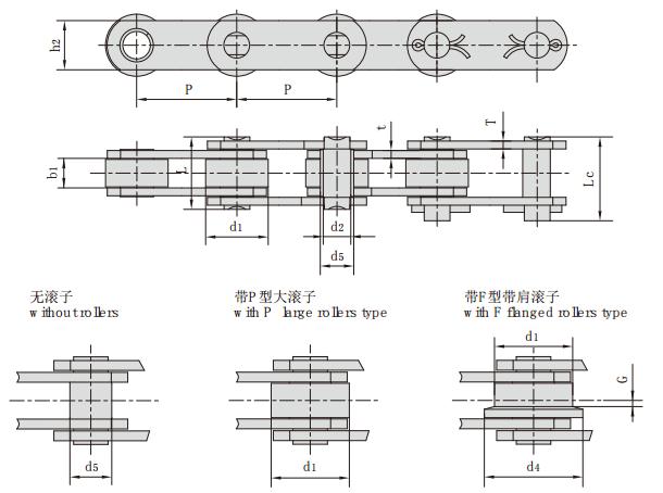 | 鏈號 | 節距 | 滾子尺寸 | 套筒直徑 | 內節內寬 | 銷軸直徑 | 鏈板高度 | 銷軸長度 | 鏈板厚度 | 抗拉強度 | ||||||||||